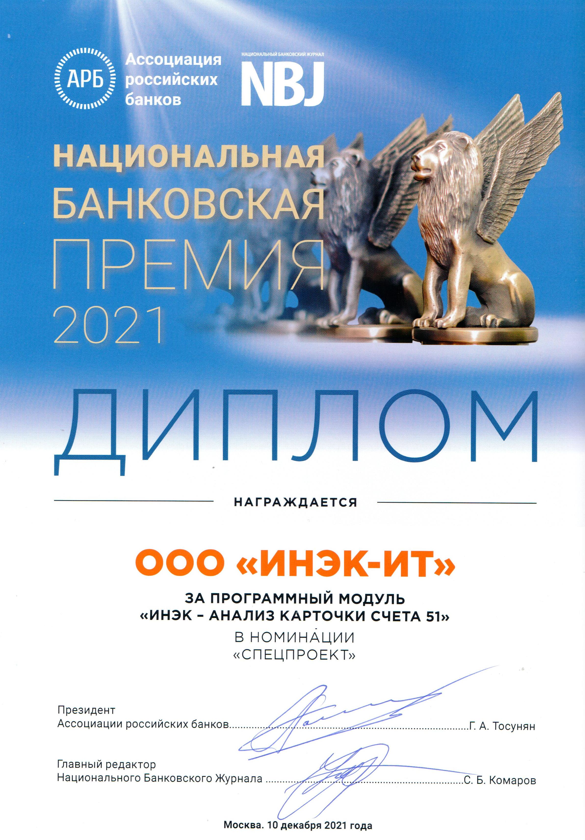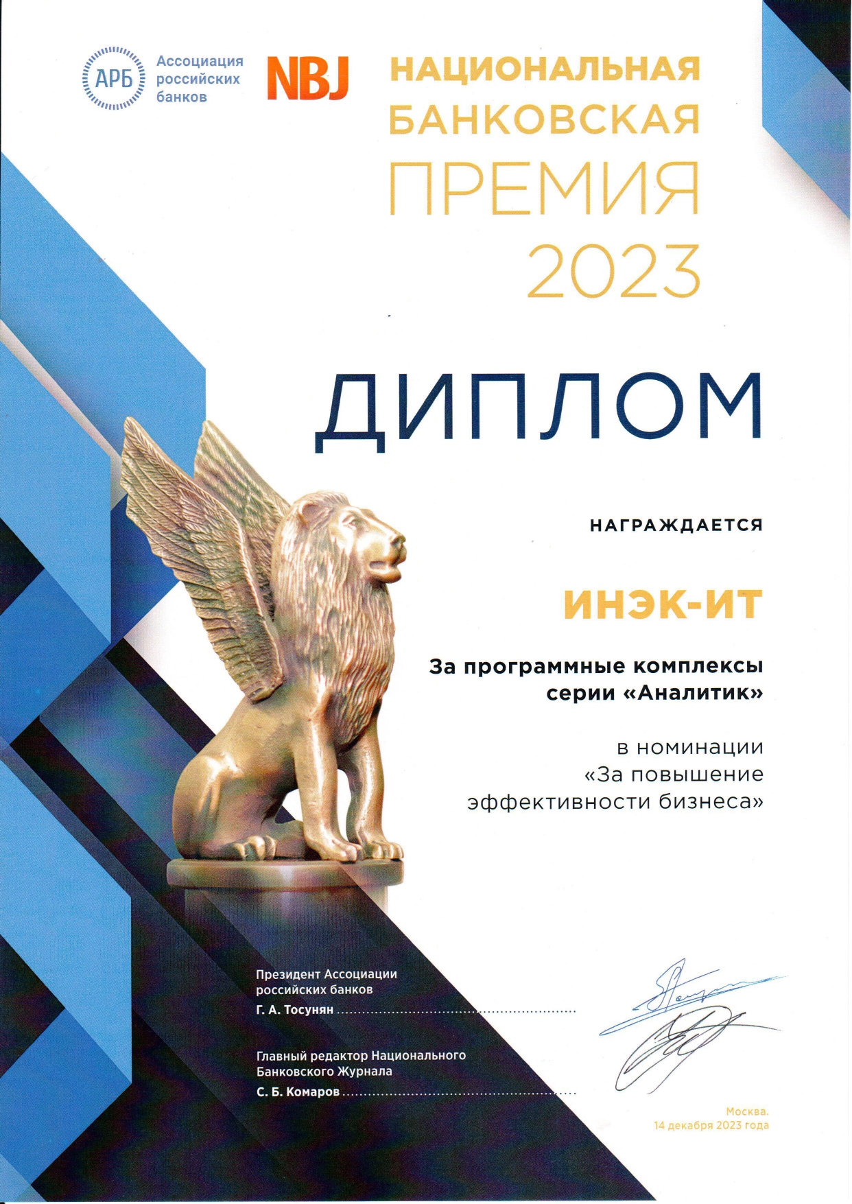14 декабря 2023 года победителей Национальной банковской премии 2023. Были определены лучшие компании финансового и IT-сектора в 38 номинациях. Организаторами премии выступали Ассоциация российских банков и Национальный банковский журнал. Наша Компания стала дипломантом в одной из номинаций текущего года «За повышение эффективности бизнеса», представляя серию программных продуктов "Аналитик".