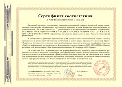 Certificate of Conformity N POCC RU.OOO1.04БТ00.00065, of December 16, 2002 of the State Standardization Committee (Gosstandart) of Russia confirms the compliance of the General Financial Accountability of the Bank II (OFO-Bank II v.3.0) with the GOST (Russian national state standards) requirements and applicable regulatory instruments of the Bank of Russia and the Russian Federation's Finance Ministry.